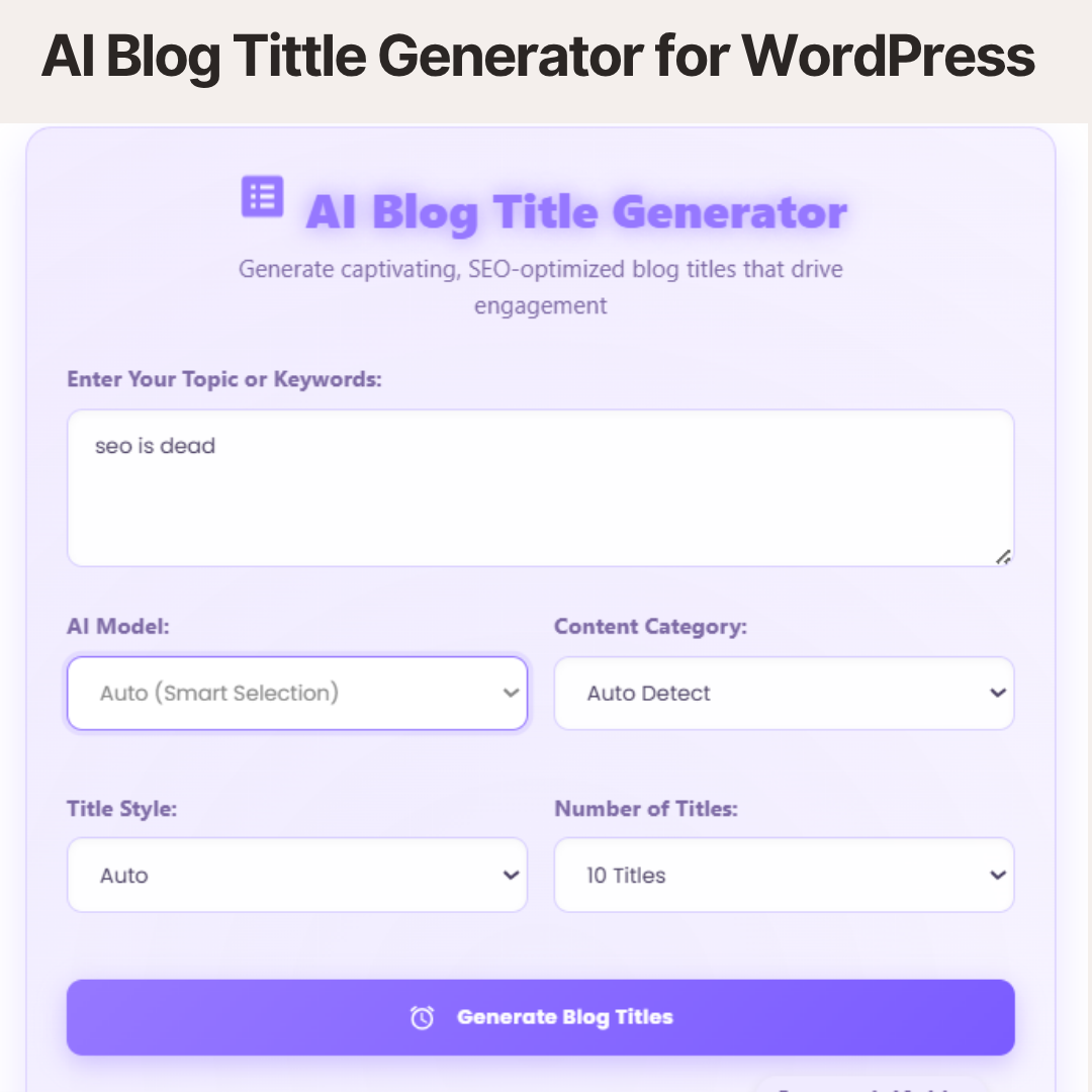 The AI Blog Title Generator is a smart, code-based PHP tool made for WordPress users that automatically generates engaging, SEO-optimized blog titles from a single keyword — without using any APIs or external services.